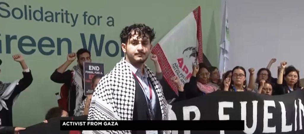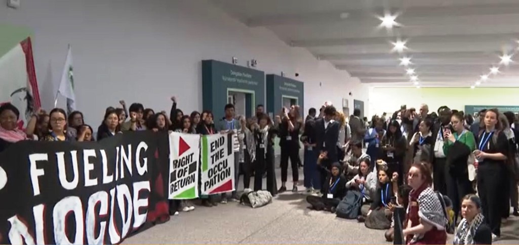 Abari mu myigaragambyo bateraniye mu kibanza cya COP29, bakoze imyigaragambyo ituje basaba ko i Gaza intambara ihagarara. Bafashe ibyapa byanditseho ngo: “Reka gukongeza itsembabwoko hagarika intambara muri Gaza!”