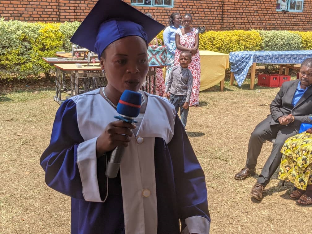 Mukandayisenga Ancille, watewe inda imburagihe ,wari warihebye uyu muryango ukamugarurira icyizere cyo kubaho,akigishwa ubudozi,akanahabwa imashini idoda,aho akora n’ibiraka byo kudoda Diyoseze itanze akaba mu ba mbere babihabwa, avuga ko atazibagirwa Kirebwa Evermelody.