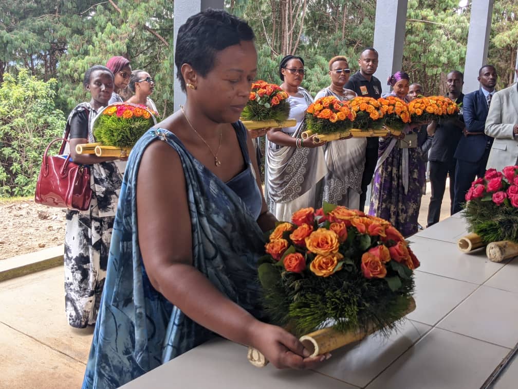Uhagarariye urugaga rw’abikorera ku rwego rw’igihugu Mubiligi Jeanne Françoise ashyira indabo ku mva zibitse imibiri irenga 50.000 y’Abatutsi biciwe mu Bisesero.