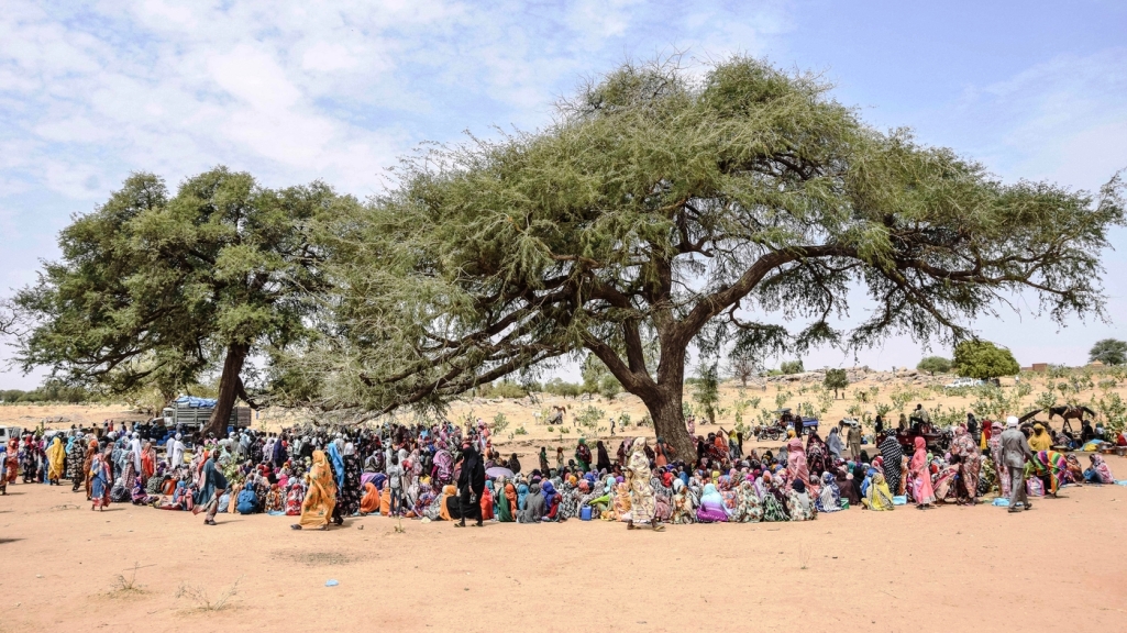 Impunzi z’Abanyasudani baturutse mu gace ka Tandelti bambutse muri Tchad, i Koufroun, hafi ya Echbara, bateranira hamwe kugira ngo bagabane inkunga
