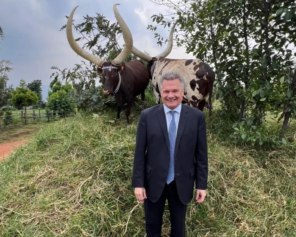 Muri ubu butumwa buherekejwe n’amafoto agaragaza aba Badipolomate basuye Inka z’Inyambo, yagize ati “Nari kumwe na Belen Calvo Uyarra, Ambasadirise w’Umuryango w’Ubumwe bw’u Burayi mu Rwanda, na Maître Rutinywa Rugeyo, Umworozi w’Inka z’Inyambo, ku Mulindi mu Karere ka Gicumbi mu Ntara y’Amajyaruguru.”