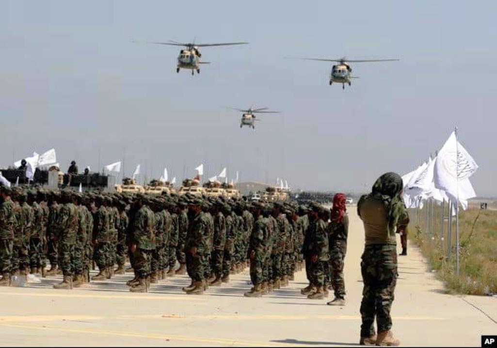 Kajugujugu ya UH-60 Black Hawk zasizwe n’ingabo z’Amerika ziguruka hejuru mu gitaramo cya gisirikare cya guverinoma y’abatalibani bizihiza isabukuru y’imyaka itatu ingabo z’Amerika zivuye mu kigo cya Bagram Air Base