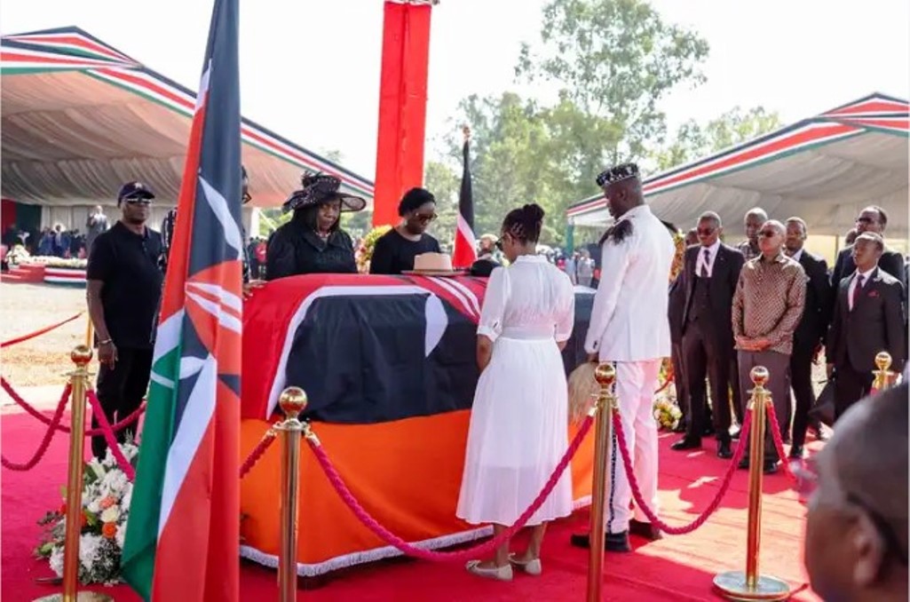 Umupfakazi wa Raila, Ida Odinga, iruhande rw’abagize umuryango, yashyize indabyo ku isanduku ye ubwo abasirikari bakuru bazungurukaga ibendera ry’igihugu bakayishyikiriza umuryango, ikimenyetso cy’icyubahiro no kubaha umurimo yakoreye Kenya.