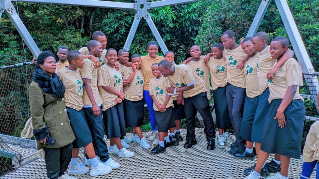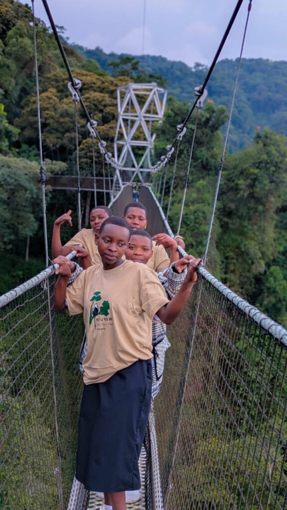 Abanyeshuri ba GS Kibyagira mu murenge wa Buruhukiro,akarere ka Nyamagabe bishimiye kugera ku kiraro cya Kanopi cyo mu bushorishori bwa Nyungwe
