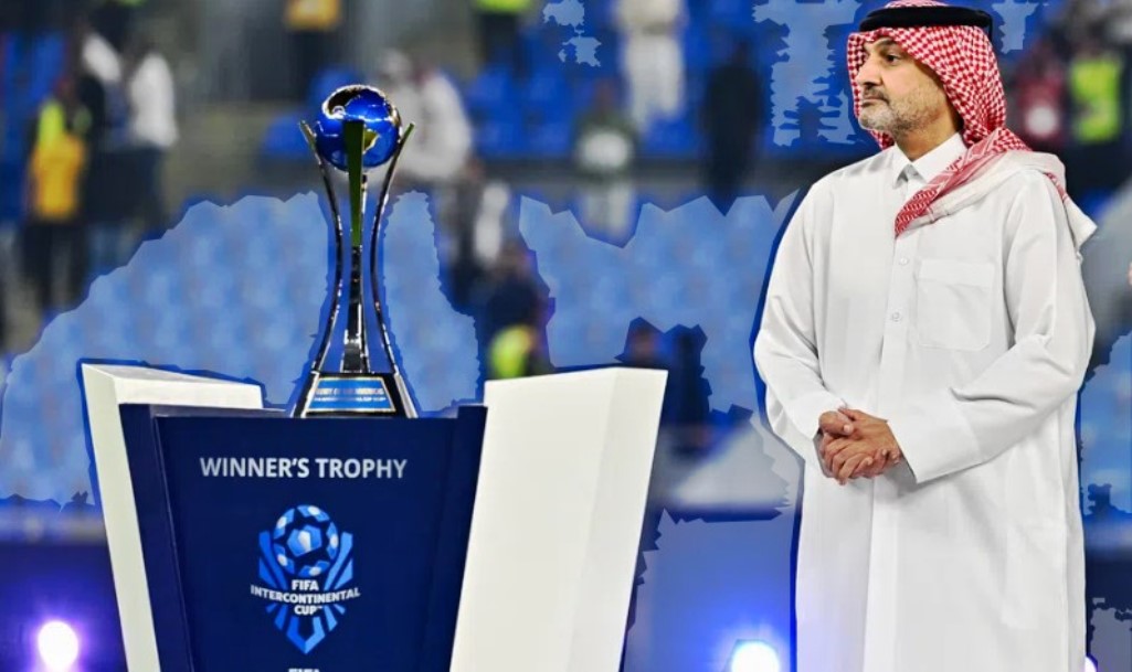 Andrea Pirlo wahoze ari umukinnyi w'Umutaliyani atanga igikombe ku musozo w'imikino ya nyuma ya Intercontinental Cup 2024 i Lusail muri Qatar
